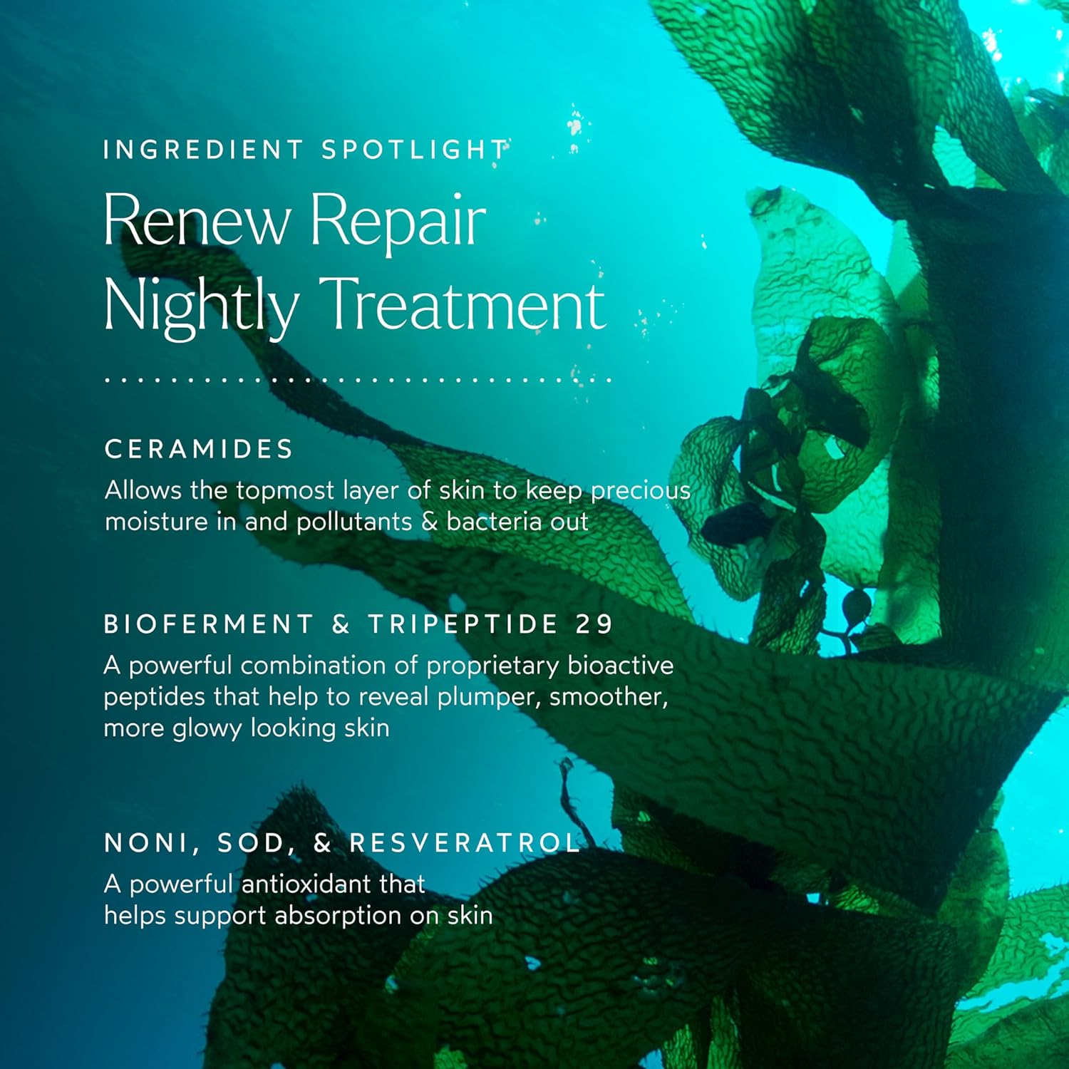 • HOW IT WORKS: Allow Your Skin To Fight Signs Of Aging + Act Young Again With This Anti-Aging Treatment. Renew Repair Nightly Treatment Is Specifically Formulated With Fermented Seaweed + Green Tea To Nourish + Reinforce The Skin Barrier.
